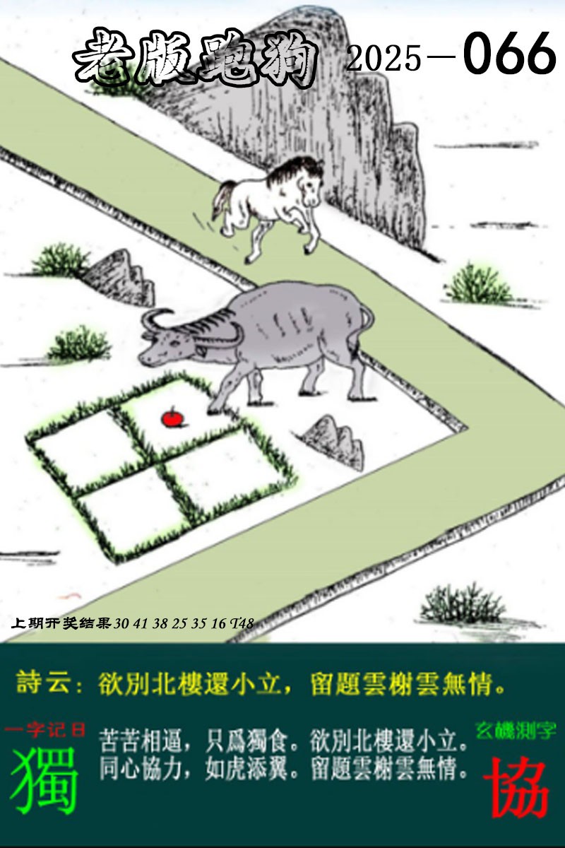 066期老版跑狗一字記之曰:【逃】 詩雲: 劉玄德三顧草廬,挟天子以令天下。無處容身,唯有外逃,劉玄德三顧草廬。適者生存,必有出路,挟天子以令天下!玄機測字:《叫》 解:無處容身,唯有外逃,凶丑:鼠牛虎猴狗猪 ============================ 065期老版跑狗一字記之曰:【望】 詩雲: 緣何難得好姻緣,貌合神離也枉然。抬望眼,問蒼天,緣何難得好姻緣。夫不忠,妻不賢,貌合神離也枉然!玄機測字:《枉》 解:夫不忠,妻不賢,凶丑:鼠牛虎猴狗猪 ============================ 064期老版跑狗一字記之曰:【防】 詩雲: 暗度陳倉怎提防,只怪大意不設防。日防夜防,防不勝防,暗度陳倉怎提防。明搶易防,暗箭難防,只怪大意不設防!玄機測字:《諉》 解:日防夜防,防不勝防,凶丑:鼠牛虎猴狗猪 ============================ 063期老版跑狗一字記之曰:【道】 詩雲: 人面不知何处去,行侠仗义出英豪。胆小如猫,坎坷道路,人面不知何处去。莲花洞木,保家卫国,行侠仪义出英豪!玄機測字:《豪》 解:胆小如猫,胆小生肖:鼠兔龙蛇羊鸡 ============================ 062期老版跑狗一字記之曰:【梭】 詩雲: 阳春三月好景色,劳苦功高无怨言,穿梭草丛,一生之计,阳春三月好景色。早上金黄,九沟八弯,劳苦功高无怨言!玄機測字:《沟》 解:劳苦功高无怨言,大肖:牛虎马羊狗猪。 ============================ 061期老版跑狗一字記之曰:【计】 詩雲: 未曾得向行人道,三心二意出厅招良策妙计,过江名士,未曾得向行人道。两仪八卦,精打细算,三心两意出厅招!玄機測字:《细》 解:良策妙计,大肖:牛虎马羊狗猪。 ============================ 060期老版跑狗一字記之曰:【敗】 詩雲: 爭食門快也門大,自尋死路招失取,同類相残,見慣不怪,爭食門快也門大。不自量力,不識号歹,自尋死路招失敗!玄機測字:《相》 解:同類相残,凶丑:鼠牛虎猴狗猪。 ============================